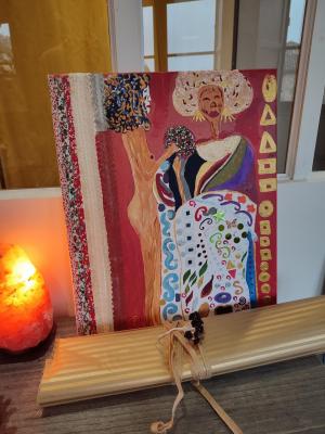 Je retire une jolie ficelle et ce beau papier. Je vois apparaitre de magnifiques couleurs et elle m'explique en quelques mots ce qu'elle a ressenti lorsqu'elle a peint le tableau en pensant à nos séances.